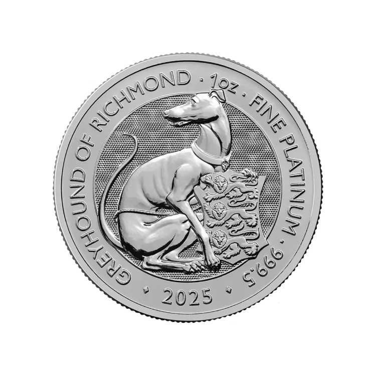De 1 troy ounce Tudor Beasts Greyhound of Richmond platina munt uit 2025 is een indrukwekkend verzamelstuk uit de populaire Tudor Beasts serie van de gerenommeerde Royal Mint. Deze platina beleggingsmunt bevat 1 troy ounce (31,1035) gram puur platina met een zuiverheid van 999,5/1000.