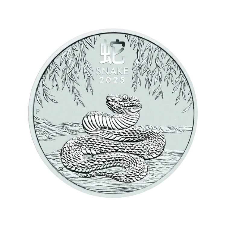 De 2025 Year of the Snake 1 oz zilveren munt van de Perth Mint is een beleggingsmunt van 99,99% puur zilver, met een ontwerp dat de Chinese dierenriemslang eert. Deze zesde uitgave in de Lunar III-serie heeft een beperkte oplage van 300.000 stuks en wordt geleverd in een beschermende acryl capsule.