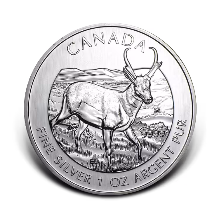 2013 Antilope zilveren Maple Leaf munten. Deze munten worden in beperkte oplage uitgegeven door de Royal Canadian Mint, waar ook de gewone zilver Maple Leaf munt wordt uitgegeven. Op de Antilope munten is op de voorzijde van de munt een afbeelding van een antilope weergegeven met het jaartal 2013.
