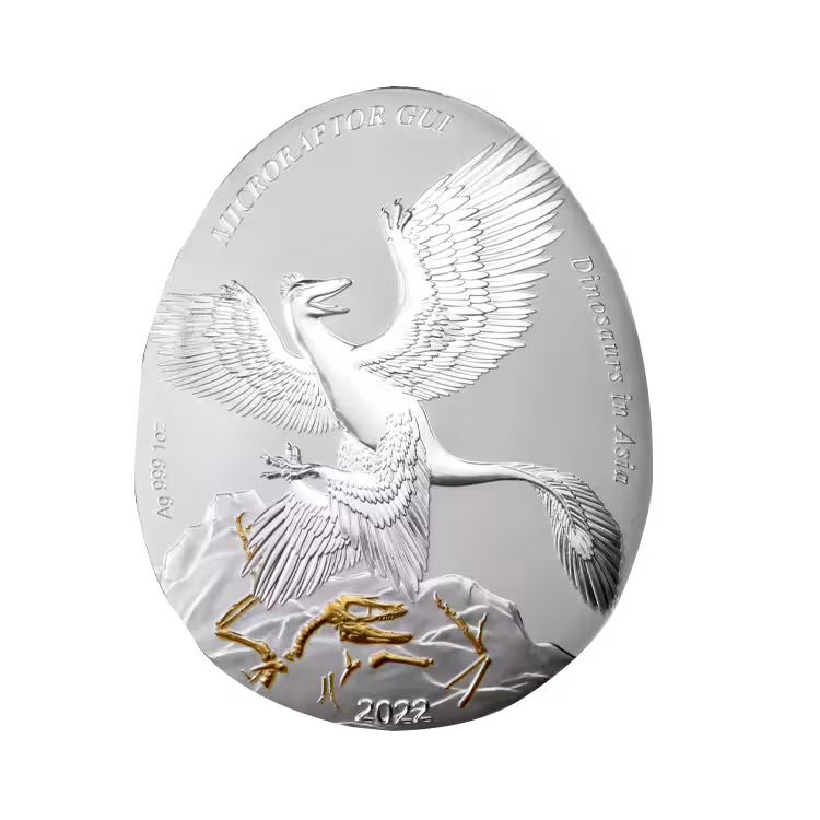 Deze 1 troy ounce zilveren Microraptor Gui munt is onderdeel van de Dinosaurs in Asia serie. De munt bevat 31,103 gram aan 99,9% puur zilver en heeft een proof kwaliteit. Deze bijzondere verzamelmunt heeft een bijzonder ovaal eivormig ontwerp. De Microraptor Gui is een klein, vleesetend vliegend reptiel met vier vleugels.