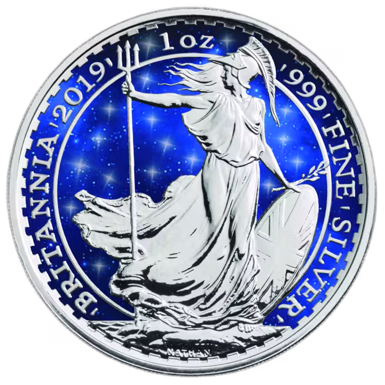 1 Troy ounce zilveren munt Glowing Galaxy Britannia 2019, inclusief certificaat van echtheid.