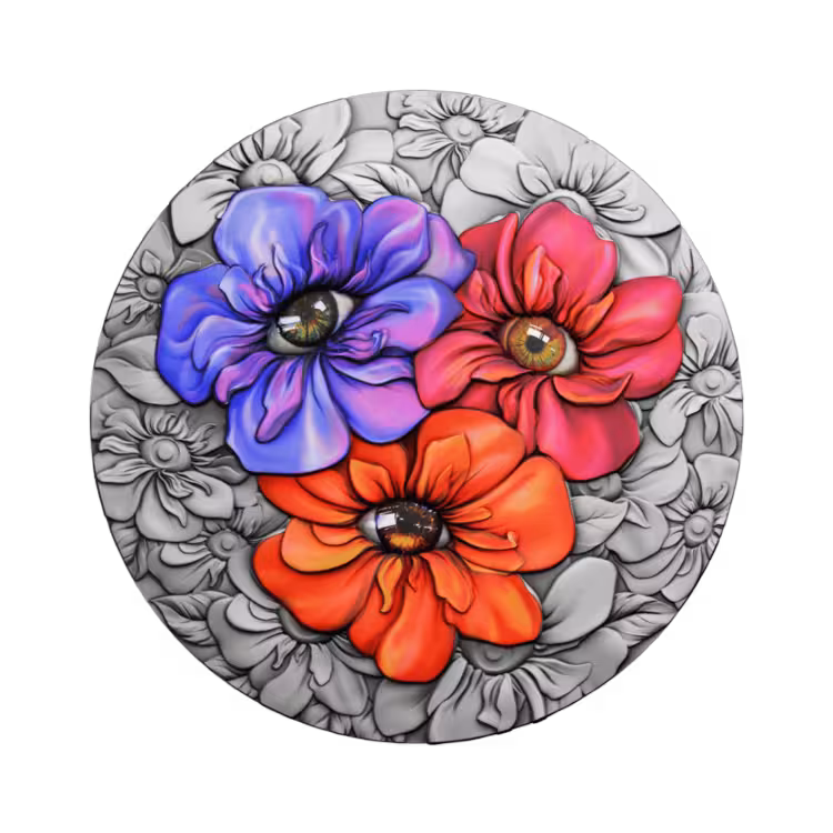 De kleurrijke Googly Eyes munt is geslagen in 1 troy ounce puur zilver (99,9%). De munt heeft naast prachtige kleuren ook een antieke afwerking. Omdat de munt als wettig betaalmiddel dient in Niue heeft deze een nominale waarde van $1. De diameter van de Googly Eyes munt is 40 mm en de oplage 1.000 stuks. Dankzij de schitterende details komen de mooie bloemen op indrukwekkende wijze naar voren. De verschillende kleuren hebben ook allemaal een betekenis. Het rood symboliseert geheimhouding, het blauw energie en oranje gevoeligheid en trots. Naast het schitterende detail hebben de kleuren dus ook een reden. De Googly Eyes munt heeft een prachtige uitstraling en is zeker een goede aanvulling aan uw collectie.