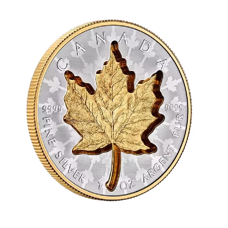 De voorzijde van de munt toont een indrukwekkende diepe vergulde gravure van de iconische Maple Leaf, het nationale symbool van Canada. Op de achtergrond is een nieuw repeterend patroon van kleine Maple Leaf bladjes toegevoegd. Daarnaast zijn de inscripties van 'Canada', het zuiverheidsgehalte '9999 Fine Silver', en het jaar '2024' duidelijk zichtbaar. Ook de rand van de munt is verguld.