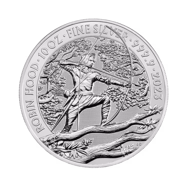 De 10 troy ounce zilveren munt Robin Hood 2023 is de grootste zilveren munt uit de mythes en legendes serie van The Royal Mint. Deze zilveren munt van 311 gram is geslagen in 99,99% puur zilver en wordt gekenmerkt door haar prachtige design met op de voorzijde van de munt een zeer gedetailleerde beeltenis van Robin Hood.