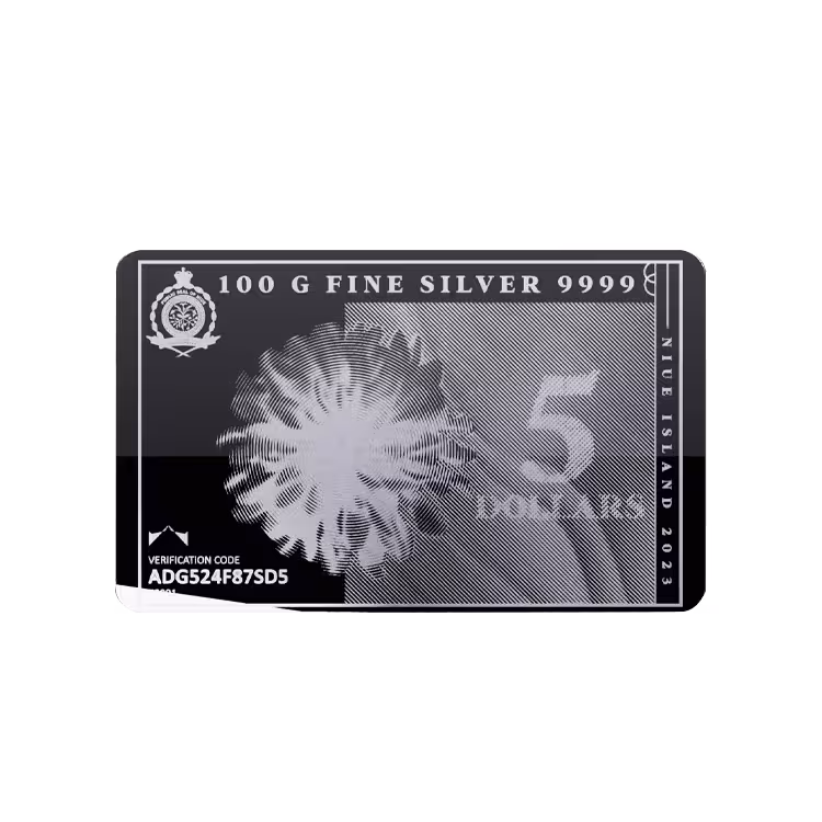 Rondom de randen van de baar is diverse belangrijke informatie te zien. Zo toont de linkeronderhoek een unieke code voor verificatie, terwijl ons wapenschild van de Niue eilanden prijkt in de linkerbovenhoek. De inscripties 100 G FINE SILVER 9999 en NIUE ISLAND 2023 zijn te vinden langs de bovenrand en rechterzijde. De achterkant van de Silvernote 2023 is blanco, wat dit stuk een ingetogen elegantie geeft.