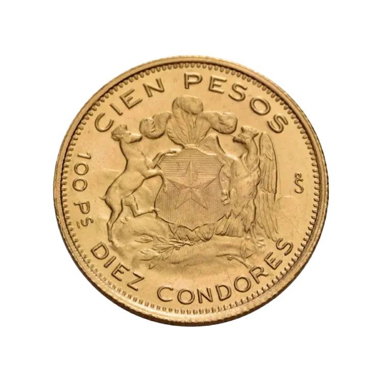 De Chileense 100 Pesos munt is een indrukwekkend en historisch verzamelstuk dat geslagen werd tussen 1932 en 1980 door de Casa de Moneda de Chile in Santiago. Deze gouden munt heeft een zuiverheid van 900/1000 en weegt ruim 20 gram, waarmee zij een solide edelmetaalwaarde vertegenwoordigt.