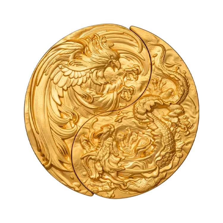 Op de voorkant van de ene munt staat een phoenix en op de andere een draak afgebeeld. Deze mythische wezens staan symbool voor de krachtigste dieren binnen de Chinese Feng Shui. Gezamenlijk symboliseren ze liefde, harmonie en saamhorigheid. Binnen het ontwerp zijn prachtige details te vinden, zoals te zien bij de kop van de phoenix en in het lichaam van de draak. Als je de munten tegen elkaar aanlegt, is zichtbaar dat het ontwerp van de munten in elkaar overloopt.