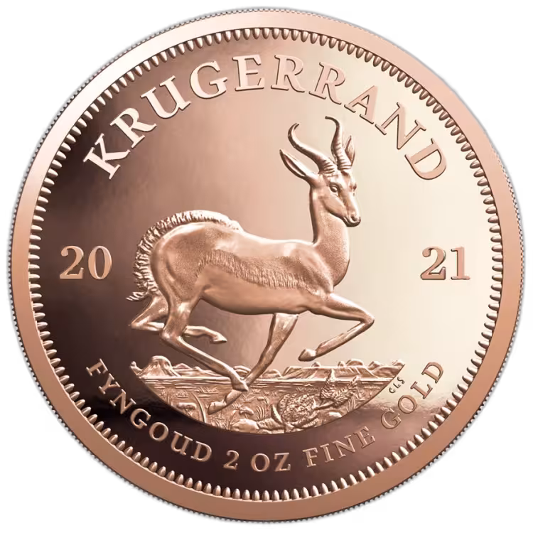 De gouden Krugerrand van Proof kwaliteit is door de South African Mint geslagen in 2 troy ounce puur goud (91,67%) met een diameter van 40 mm.