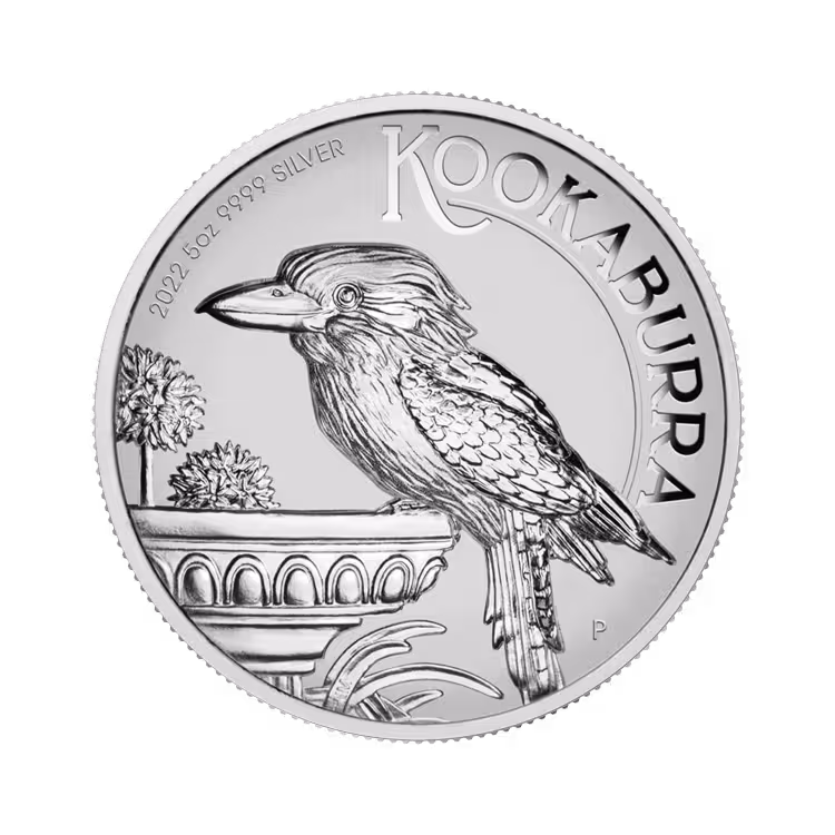 Het ontwerp van deze 5 troy ounce munt toont een voorstelling van een kookaburra die op een sierbad met vogels zit tussen Agapanthus, bloeiende planten die regelmatig in Australische tuinen worden gezien. De keerzijde bevat ook het opschrift 'KOOKABURRA', het muntteken 'P' van The Perth Mint en het gewicht, de zuiverheid en het jaartal van de munt in 2022.