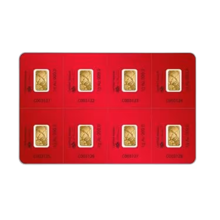 De PAMP Suisse Lunar goudbaar 8x 1 gram bestaat uit 8 kleine goudbaren die ieder uit 1 gram 99,99% goud bestaan. De PAMP Suisse heeft deze goudbaartjes geproduceerd en baseerde deze op de Chinese dierenriem kalender.
