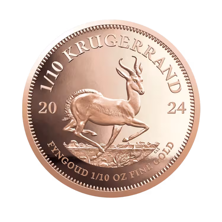 The obverse of the coin features a springbok, the national coat of arms of South Africa. Around it are the inscriptions KRUGERRAND - the name of the coin, 2024 - the year of issue and FYNGOUD 1/10 OZ FINE GOLD - the metal type and weight of the coin.