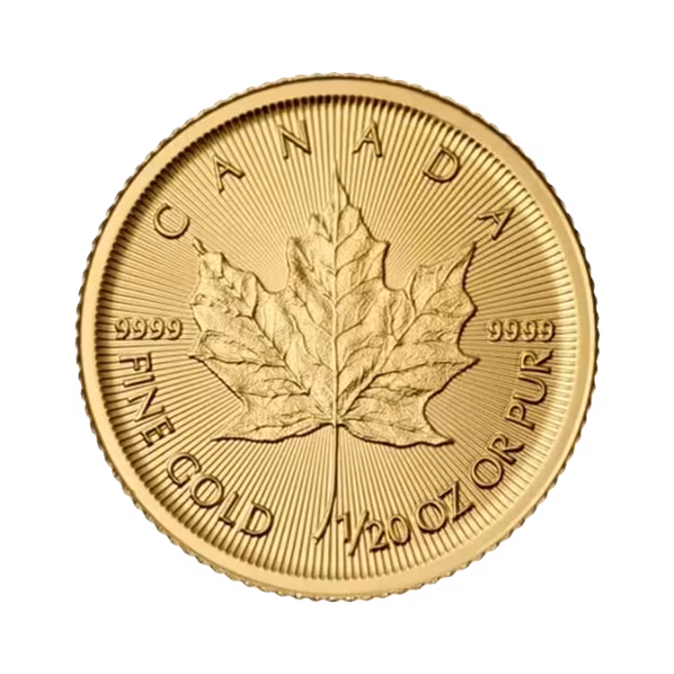 The 1/20 troy ounce gold Maple Leaf coins are minted from 99.99% pure gold, making them one of the coins with the highest possible gold content. Weighing 1.555 grams, this coin offers a compact yet valuable option for investors in physical gold.