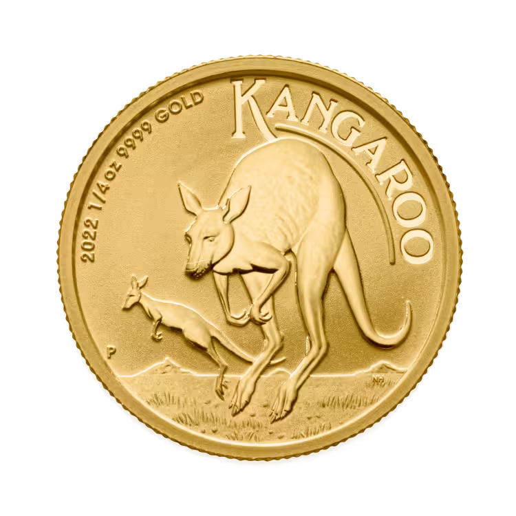 The 2022 gold Kangaroo coin is a beautiful specimen, issued by the prestigious Perth Mint in Australia. This coin, made of 1/4 troy ounce of pure gold (99.99%), is known for its iconic design and exceptional quality. The central theme of the coin is the kangaroo, an animal that is unique to Australia and symbolizes the country's rich biodiversity.