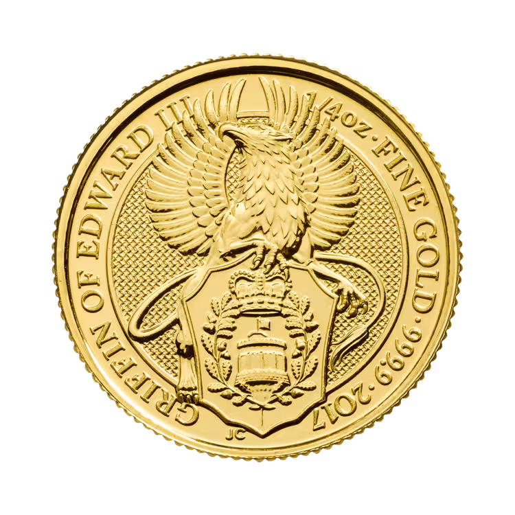 Gold Queens Beasts coins - 2nd coin in the series: The Griffin - struck by the Royal Mint from the UK.