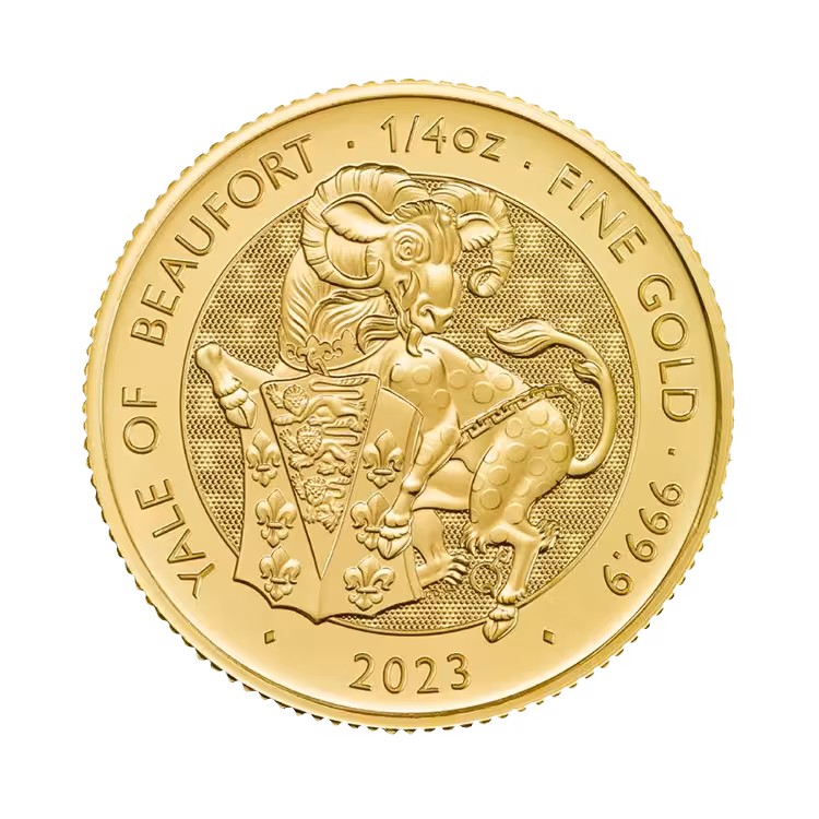 The 1/4 troy ounce gold coin Tudor Beasts Yale of Beaufort 2023 features as the name suggests The Yale of Beaufort, this mythical creature is portrayed in an impressive design full of beautiful features. The Yale is formed of the body of a goat, the tusks of a boar and the tail of a lion. Surrounding the image of The Yale are the words ""YALE OF BEAUFORT ∙ 1/4oz ∙ FINE GOLD ∙ 999.9". At the bottom of the coin is written 2023, the year of issue.