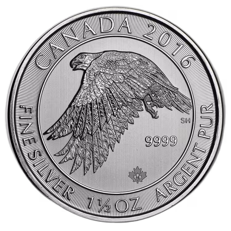 2016 Silver coin 1.5 troy ounce Snow Falcon by the Royal Canadian Mint. This coin is struck in 1.5 troy ounce fine silver (99.99% purity).
