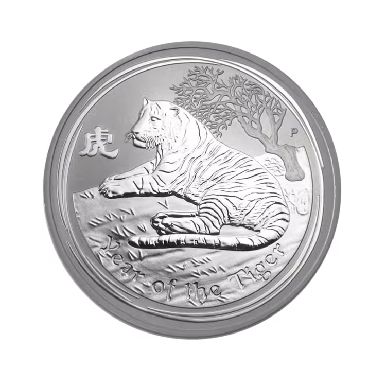 The 1-kilogram silver Lunar coin from 2010 is part of the Lunar II series. The Lunar II series has been issued since 2008 and each year showcases a design related to one of the 12 animals of the Chinese zodiac.