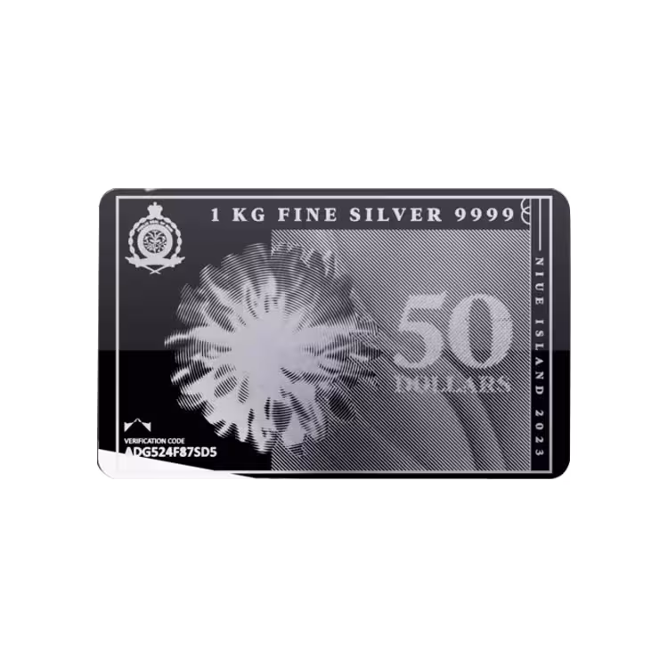 Along the edges of the bar is various information to be found. For example, in the bottom left corner, the unique bar number, verification code, of the bar is clearly visible. The coat of arms of the Niue islands is added in the top left corner and along the top and right edge, the text 1 KG FINE SILVER 9999 and NIUE ISLAND 2023 is displayed. The reverse of the Silvernote 2023 is blank.