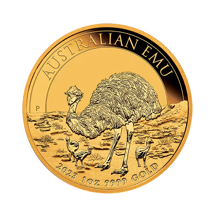 This 1 troy ounce gold Australian Emu coin from 2023 contains 31.103 grams of 99.99% fine gold. The coin is minted by the Perth Mint and is the latest edition of the Australian Emu series.Â