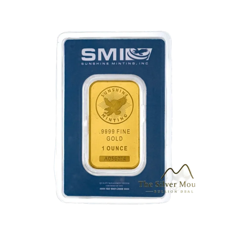 Gold bars by Sunshine Mint, issued at the United States of America. One troy ounce fine gold bullion. We offer the gold bars in original packaging with certificate of authenticity included.