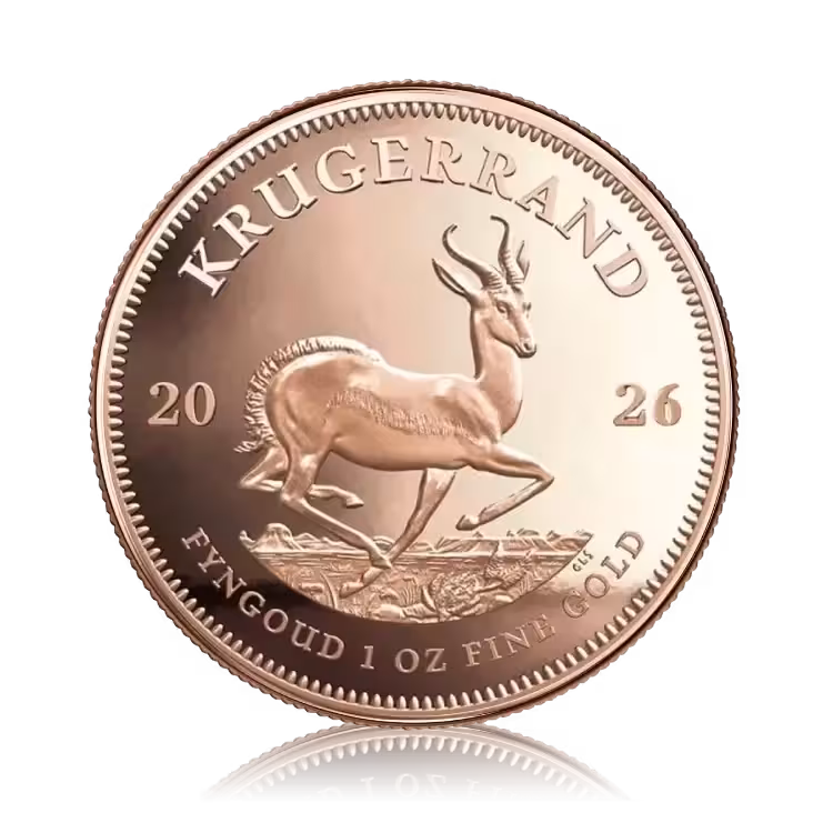 This is a new gold Krugerrand coin from 2026. Originating from South Africa, this coin contains 1 troy ounce of pure gold. Globally, the Krugerrand is one of the most renowned gold investment coins.
