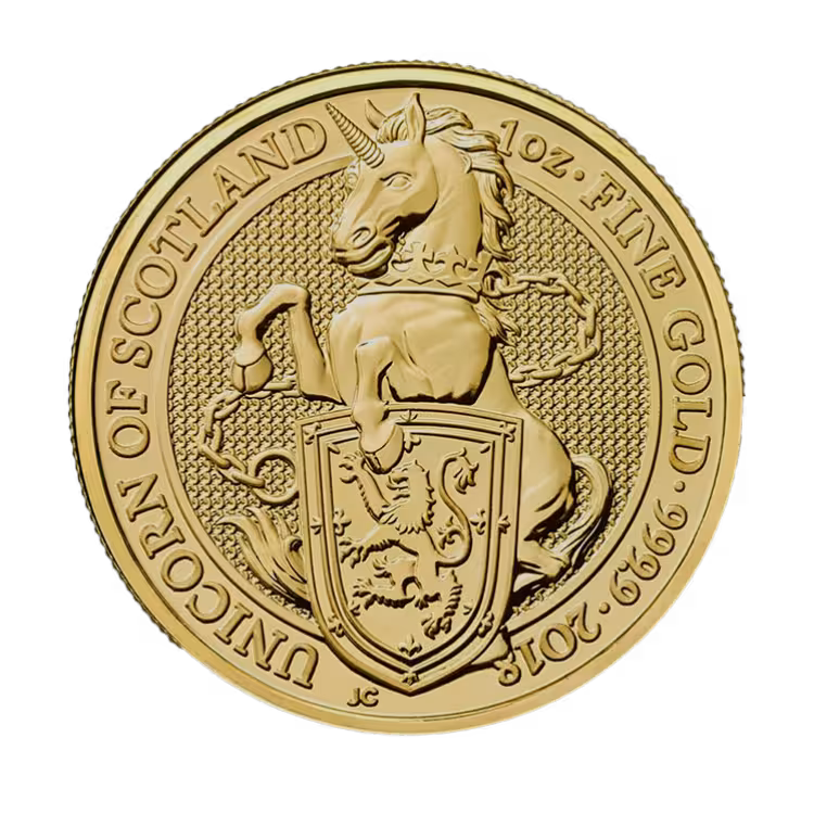 1 Troy ounce gold Queens Beasts Unicorn coin. Minted by the Royal Mint from England. These gold coins contain 31.103 grams of fine gold.