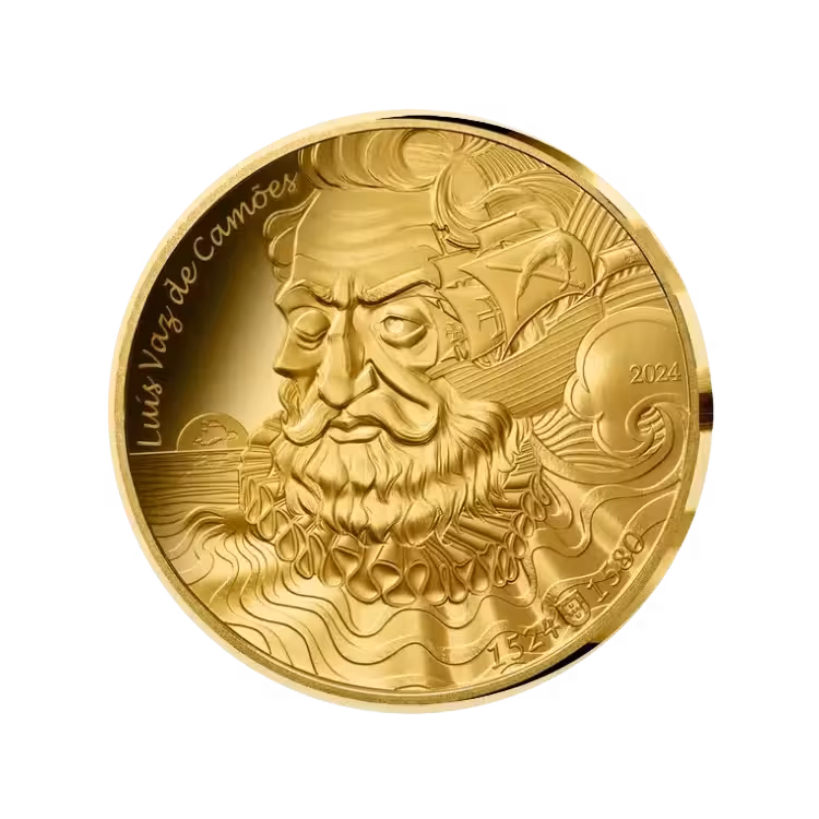 The 1 troy ounce gold Luís Vaz de Camões proof coin (2024) from the series The Art of the Pen honors the Portuguese poet Camões. The coin is struck in proof quality, has a limited mintage of only 250 pieces worldwide.