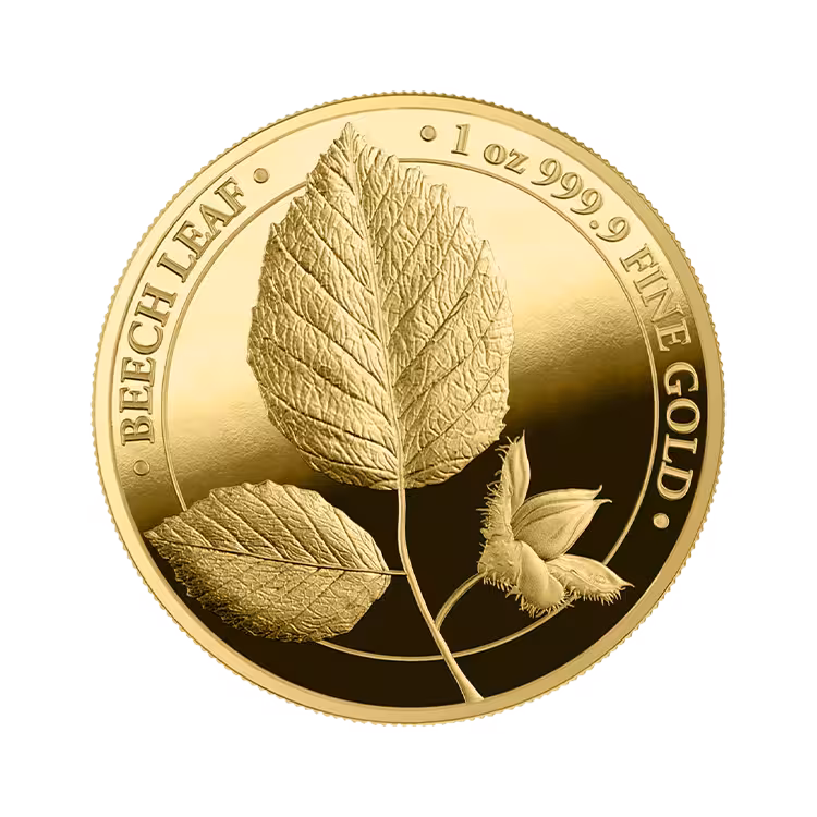 This 1 troy ounce (31.103 gram) gold (99.99%) Mythical Forest Beech Leaf coin has a proof quality and is the fourth and final edition of the Mythical Forest series. This series is a tribute to the power and mysticism of trees. On the front you can see a beautifully detailed beech leaf and its flower. The reverse shows a double-headed eagle, symbolizing the past and the future. The coin comes in a wooden presentation box together with the certificate of authenticity. The worldwide edition is limited to only 100 pieces.