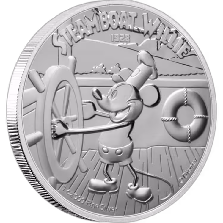 The 1 troy ounce silver Steanboat Willie coin weighs 31.103 grams and is made of pure silver (99.99%). The coin is minted in proof condition and has a circulation of 1,928 pieces.