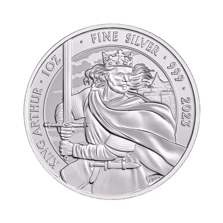 The silver King Arthur coin is the fourth coin from The Royal Mint's Myths and Legends series. The King Arthur design was created by David Lawrence.