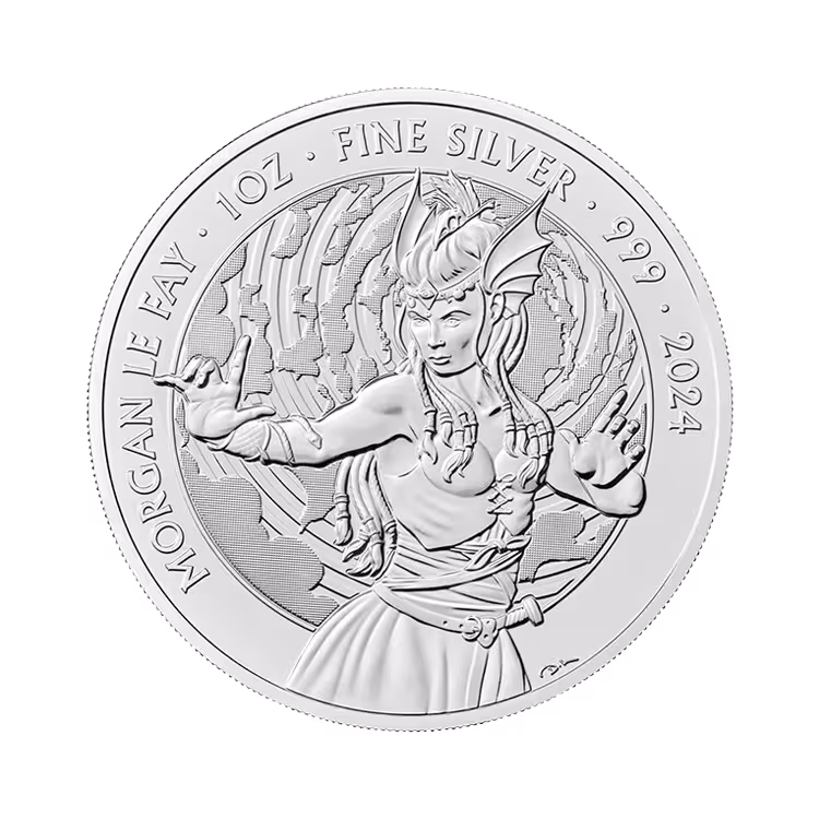 The 1 troy ounce (31,103 grams) silver (99,9%) Morgan Le Fay coin was issued in 2024 by The Royal Mint and depicts one of the characters from the Arthurian legends. This coin is the third and final release from the second Myths & Legends series.