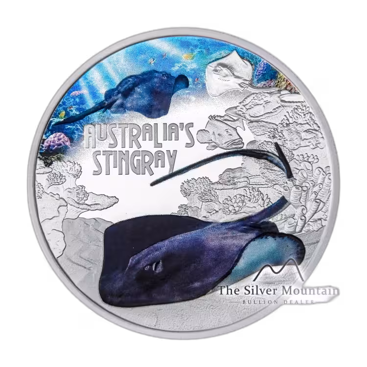 The beautifully colored Stingray coin is a stunning pure silver coin of Proof quality. The Stingray coin has a weight of 1 troy ounce and a diameter of 40.6 mm.