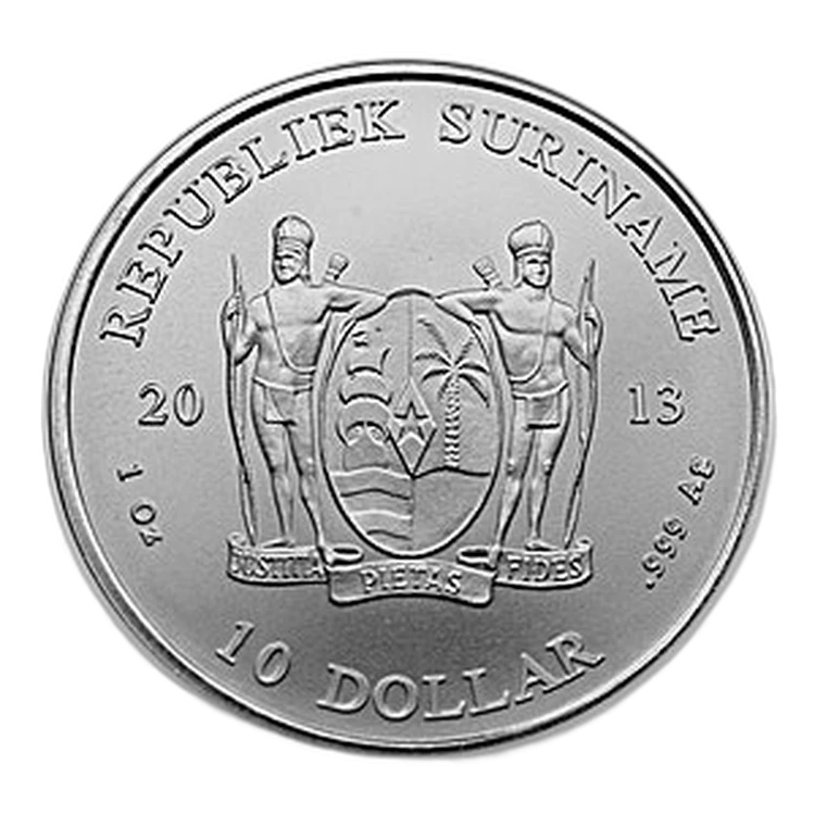Limited available: 1 troy ounce silver Suriname Dollar coins. These coins contain 1 troy ounce fine silver (99.9%) each. Suriname Dollar coins are legal tender in Suriname.