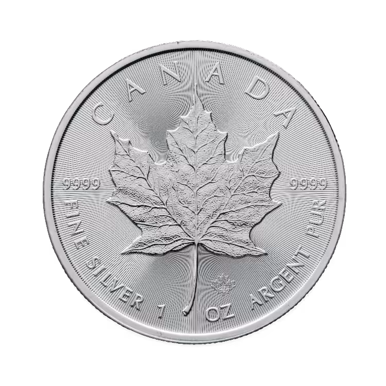The 1 troy ounce silver Maple Leaf coin is a globally recognized investment coin, minted by the Royal Canadian Mint from 99.99% pure silver. The iconic maple leaf, the official symbol of Canada, is prominently featured on the Silver Maple Leaf coin.