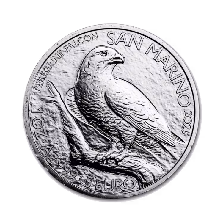The 2025 San Marino Peregrine Falcon is the second annual issue of this official silver investment coin, struck by the renowned Austrian Mint. With a limited edition of only 20,000 pieces and an iconic falcon design, this is a popular collector's item as well as a solid silver investment.