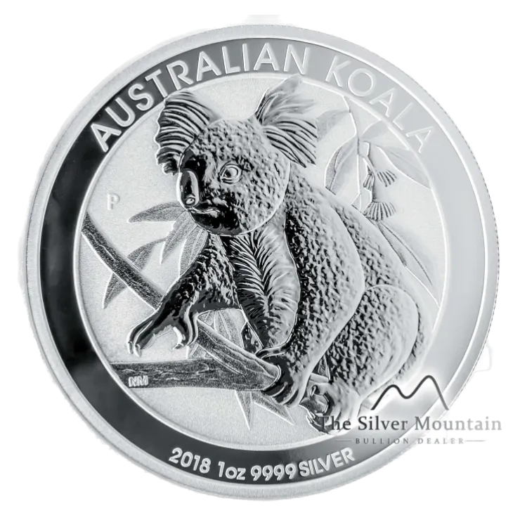 Silver 1 troy ounce Koala coins of 2018. These coins are minted by the Perth Mint of Australia and contain 31.103 grams of pure silver.