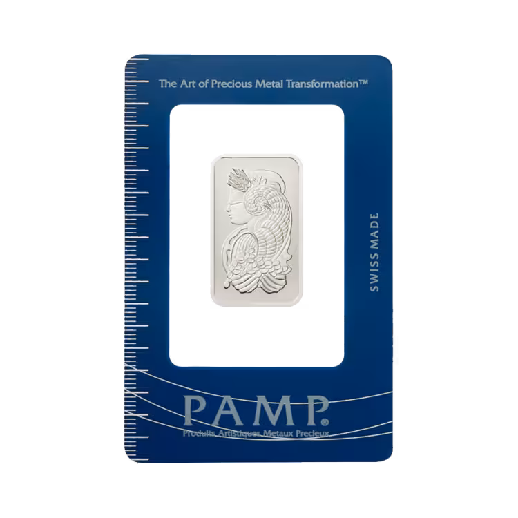 Pamp Suisse is a recognized producer of gold, silver, and platinum bars and holds Good Delivery Status. What sets Pamp Suisse bars apart is the design featuring Lady Fortuna. Both the bar itself and the packaging display the beautiful image of Lady Fortuna, the Roman goddess of fortune (luck).
