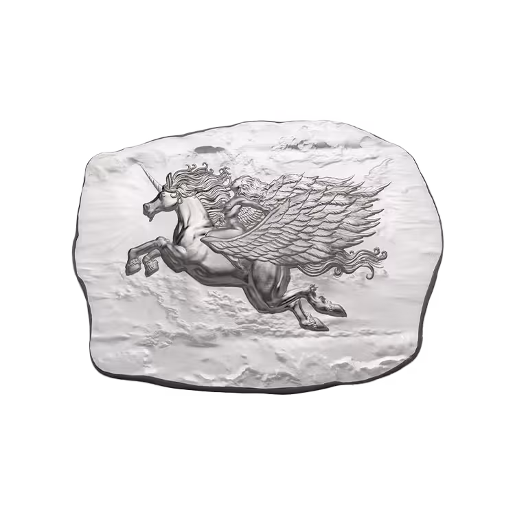 The 10 troy ounce silver bar Winged Unicorn is part of the beautiful series of Ultra-High Relief Art Bars. The six bars in this series have an ultra-high relief design and are designed with great care. The special playful shape combined with the Ultra High Relief effect makes this silver bar popular with collectors. On both the front and back of the silver bar, much attention has been paid to the design.