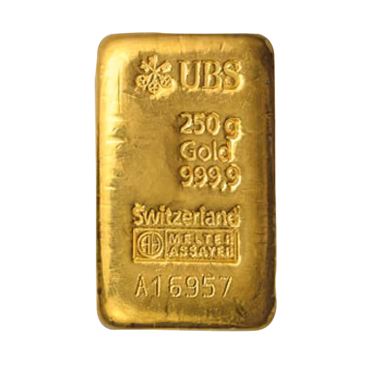 The 250 gram UBS gold bar is a high-quality investment bar made of pure gold (99.99%). Minted by the renowned Swiss bank UBS (Union Bank of Switzerland), this bar guarantees quality and reliability. Each bar is provided with a unique serial number and comes with a certificate of authenticity. Thanks to its handy size, this gold bar is a popular choice among serious investors who want to expand their portfolio with physical precious metals.