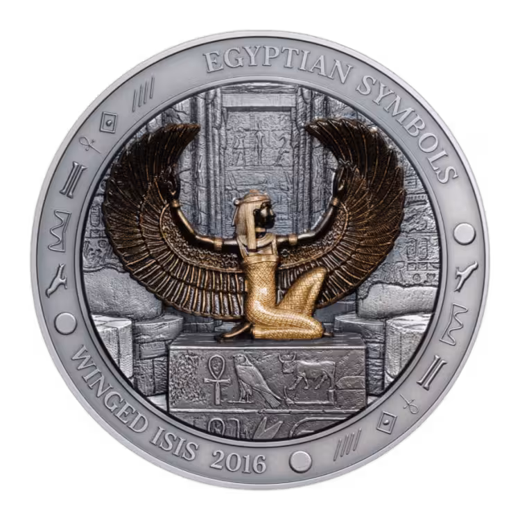 This 3 troy ounce silver coin is part of the "Egyptian Symbols" series and is dedicated to the ancient Egyptian Goddess Isis.