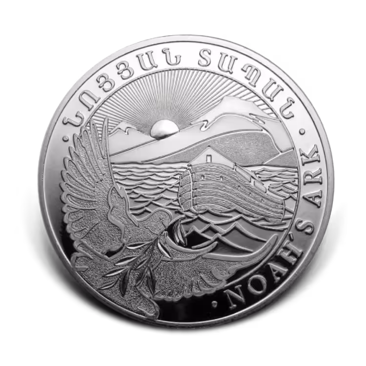 The 5 troy ounce Silver Noah’s Ark coin contains 5 troy ounces (155.5 grams) of 99.9% pure silver. This bullion coin is issued by the Central Bank of Armenia and produced by Geiger Edelmetalle in Germany. The coin has a face value of 1,000 Armenian Dram and is delivered in a protective capsule.
