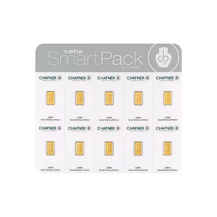 The 10x 2 gram SmartPack is newly minted by C. Hafner and contains 99.99% pure gold. This product is suitable for purchasing small denominations of gold at relatively low cost. The blister packaging includes the CertiCard ® authenticity certificate with a unique bar number for each gold bar.