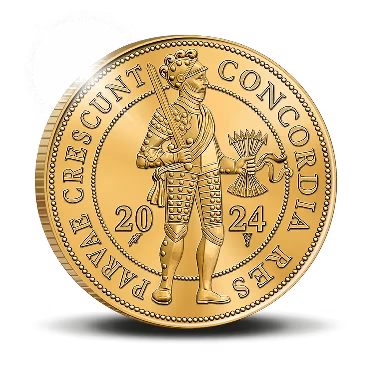 The obverse of the Double Golden Ducat 2024 shows a knight with a sword and a bundle of arrows in his hands. The knight is dressed in an armour with distinctive buttons. Along the rim is the motto "Concordia Res Parvae Crescunt", Latin for "Unity makes small things grow". The year of issue 2024 is also clearly displayed in two parts. The obverse is finished with a double circle of dots. This design is based on a design by Johan Willem Marmé, a Dutch engraver who worked at the Mint of Utrecht in the 18th century. The design has been used for the Dutch Gold Ducats since 1956. The knight on the obverse of the coin is a symbol of Dutch strength and unity. The sword and the bundle of arrows represent the willingness to fight for the homeland.