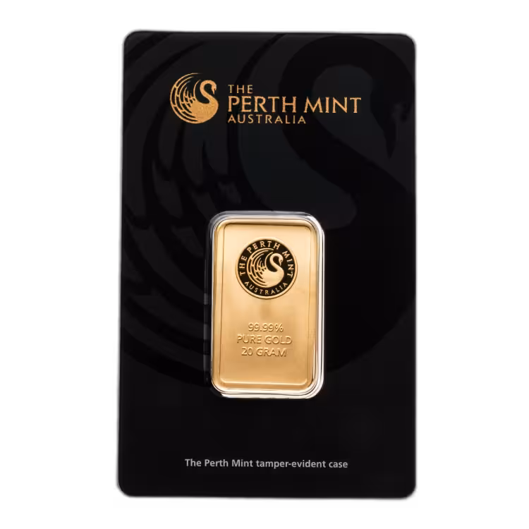 The Perth Mint 20g Gold Bar is crafted from 99.99% pure gold, guaranteeing quality and craftsmanship. The obverse features the iconic Perth Mint logo – an elegant swan – along with the 20g weight and gold purity. The reverse features a kangaroo pattern, a nod to the Australian origins of this renowned producer. Each bar is individually sealed in a sturdy, tamper-proof assay package with a unique serial number and the signature of the official Chief Assayer, certifying the authenticity and gold content. This 20g Gold Bar is an ideal choice for both novice and experienced precious metal investors.