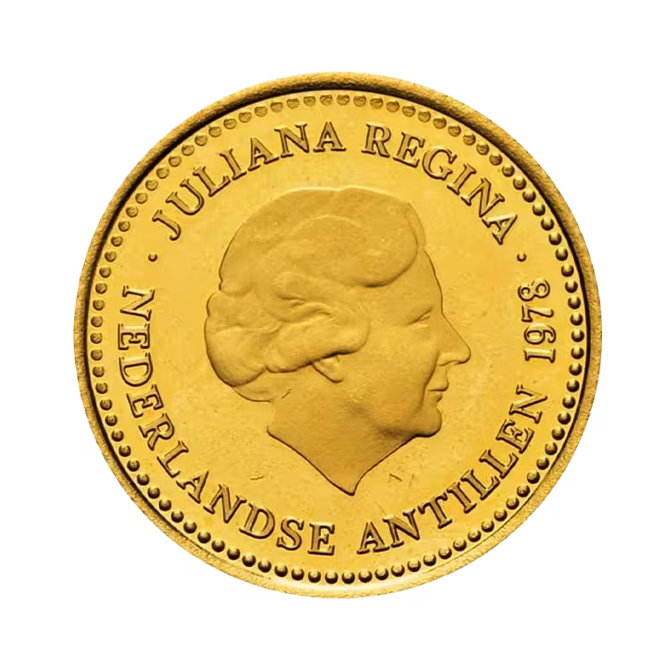 Gold coin 100 Guilders - Netherlands Antilles. This coin was struck by Franklin Mint. Contains 6.05 grams of pure gold.