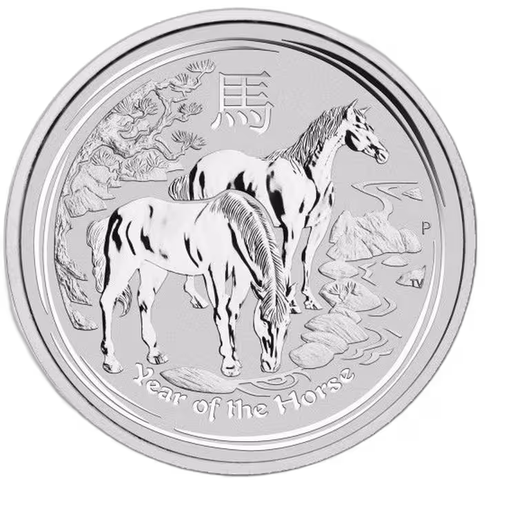 Half troy ounce silver Lunar coin 2014 - year of the horse. These coins have a weight of 15.55 grams of fine silver and are struck by the Perth Mint from Australia.