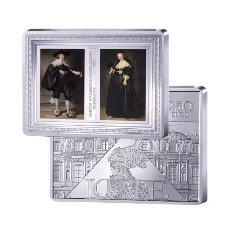 This impressive €250 silver commemorative coin from 2025 is issued by Monnaie de Paris and pays tribute to two of the most celebrated portraits in European art history: Marten Soolmans and Oopjen Coppit, painted by Rembrandt van Rijn in 1634. These life-size marriage portraits are among the absolute masterpieces of the Dutch Golden Age and are jointly owned by the Rijksmuseum and the Louvre. With this exclusive issue, the unique historical and artistic value of these iconic works is captured in a remarkable numismatic form.