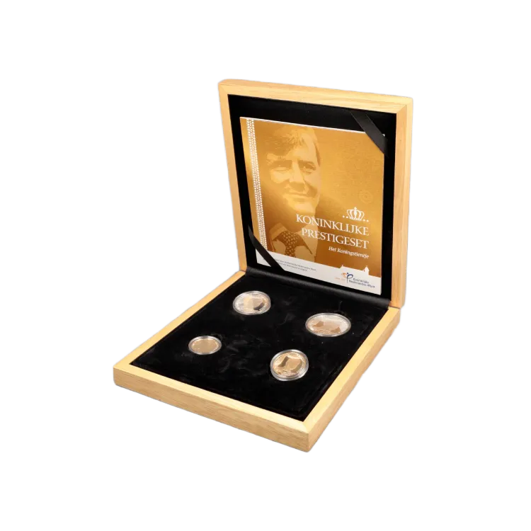 Royal Prestige Set 2013 with all official issues of the King's Tenner: €10 BU silver-plated, €10 silver Proof, €20 gold Proof and the exclusive €50 gold Proof. Issued in honour of the inauguration of King Willem-Alexander. Only 1,000 pieces issued, in a luxurious wooden cassette with certificate of authenticity. A unique set for the collector of Dutch royal coins.