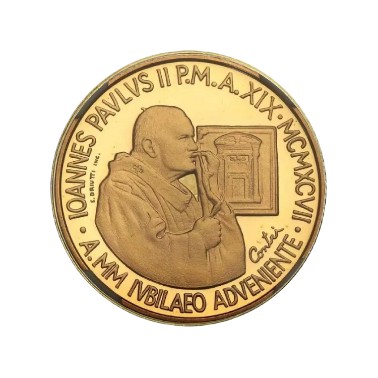 The coin is made of 22 carat gold (.917) and weighs 15 grams. On the obverse we see Pope John Paul II at the Holy Door, with the Latin inscription “IOANNES PAVLVS II PMAXX.MCMXCVIII A.MM IVBILAEO ADVENIENTE”. The reverse shows a detailed image of the Basilica of Santa Maria Maggiore with the text “CITTA' DEL VATICANO – L.100000 – and the year”.