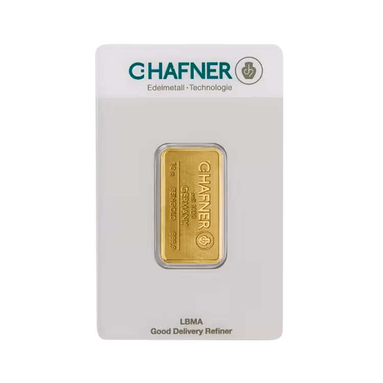De C. Hafner goudbaar van 10 gram is geslagen in 99,99% puur goud. Deze nieuw geslagen goudbaar is voorzien van een CertiCard ® echtheidscertificaat. C. Hafner is een LBMA Good Delivery Refiner, goudbaren van C. Hafner zijn hierdoor wereldwijd goed verhandelbaar.